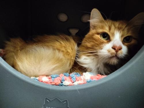 This sweet, fluffy orange and white boy is looking for a calm, loving home. He was adopted from us as a kitten and recently returned through no fault of his own after his owner lost her housing and could not keep him. Understandably, he’s still adjusting to the shelter environment.