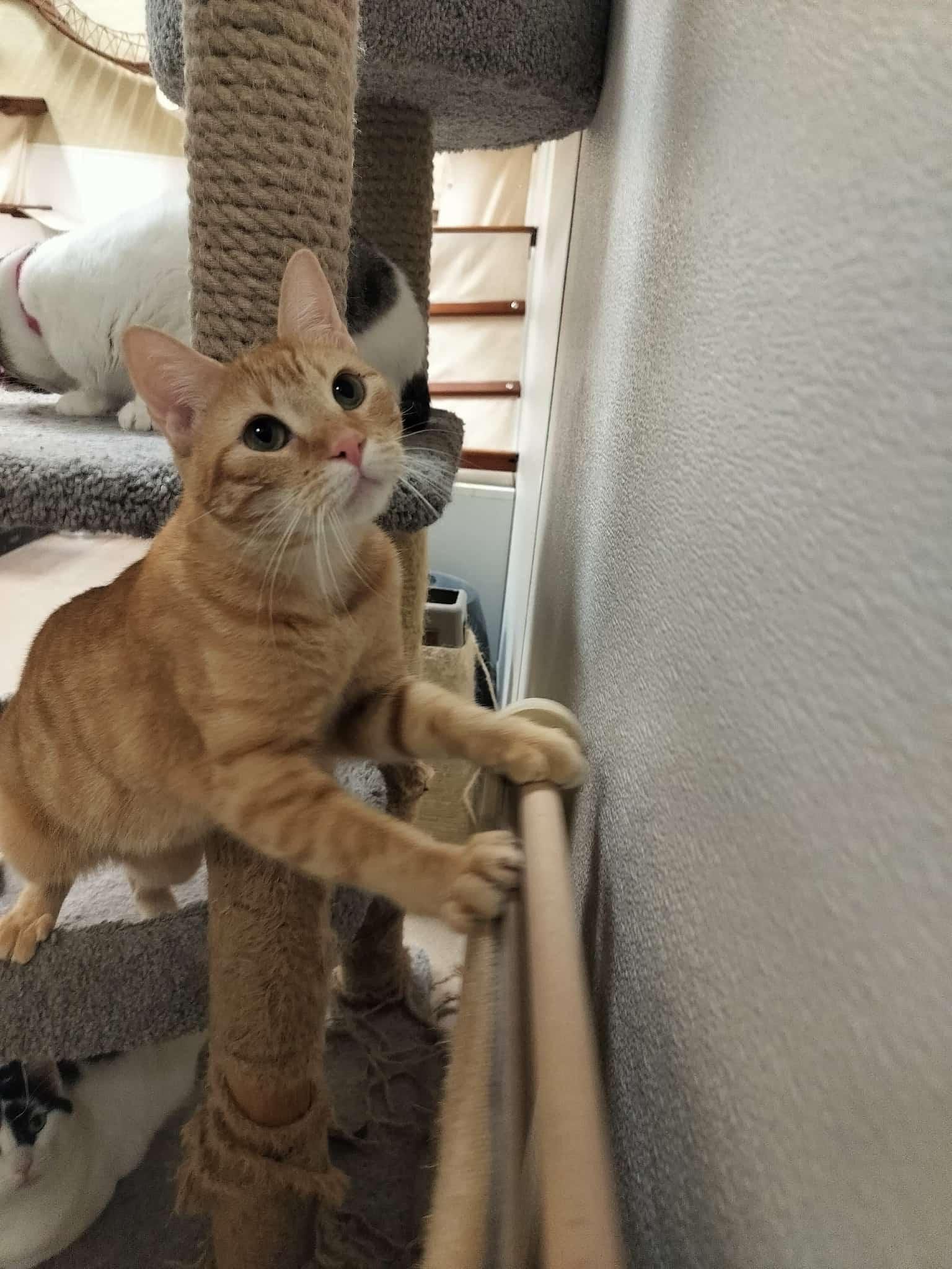 Furry treasure Tawny’s silky smooth, orange-striped suit is unusual for an iconic tabby girl kitty, but purrfect for this gentle, sunny-spirited sweetheart! At one year old, she gets along well with other cats, kittens, a small dog, and was especially fond of her beautiful sister, Trixie (already adopted). Timothy, Trixie, and Tawny were happy playmates in every romp and race and also great cuddle buddies if a warm lap isn’t available. This easy-going girl loves hugs, cuddles, and cozy lap naps, but is never needy or demanding. Her lovely green eyes are a window to her loving heart and the focus of her picture-perfect, sugar-dusted face. Could marmalade orange Tawny bring her love and companionship to your welcoming world?