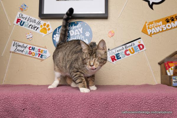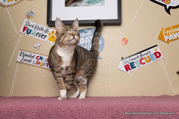 Cali is a young blind kitten who’s as independent as she is affectionate. She enjoys the company of her two kitten friends but also loves her quiet moments—lounging near her human or perched up high in her favorite cat tree, taking in the world around her.