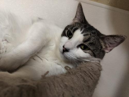 I am a very chill cat. I meow when I want your attention and will stare up at you until I get picked up and held. I do like to nibble on fingers, but I won't nibble too hard. I love to snuggle on your lap all day while you are working. I love wet food and will scream as soon as I hear a can open. I like to climb up you leg if you don't pay attention to me enough, so give me all the love you can! I am a good kitten who knows how to use a litter box. I get along well with dogs and other cats. Take me home today.