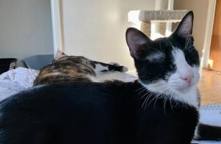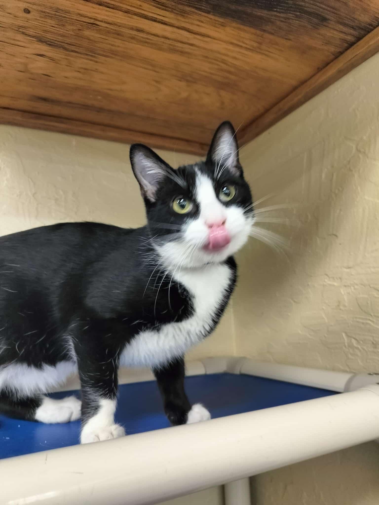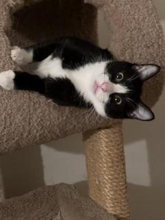 Billy Bob is a handsome black and white (tuxedo style) soft short-haired boy. Billy Bob is a gentle, well-mannered kitty.