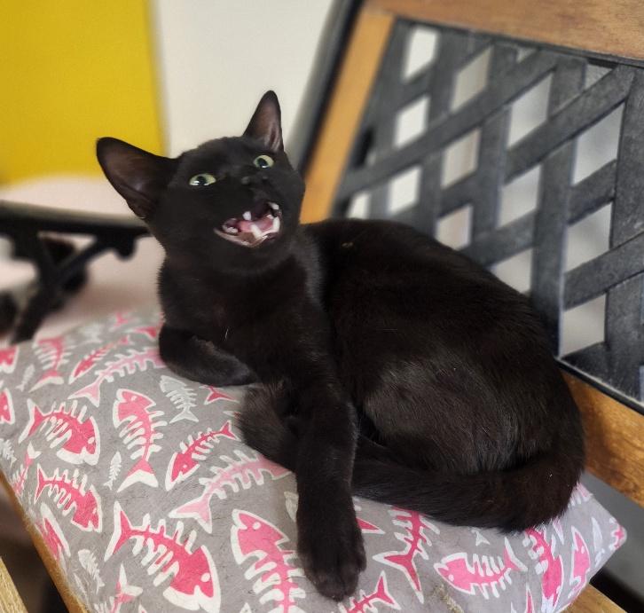 Handsome little Miles is silky smooth and polished as ebony with a personality as warm as sunshine! His big, bright eyes take in everything - he'll be curious about everything you do. He loves to be petted and talked to and always hopes you'll find some time to invite him into your arms or lap for a cuddle or a nice nap! He doesn't mind other cats or the old office dog. Wouldn't a glossy black, sugar-sweet, happy-go-lucky little guy named Miles be purrfect for your loving forever home?