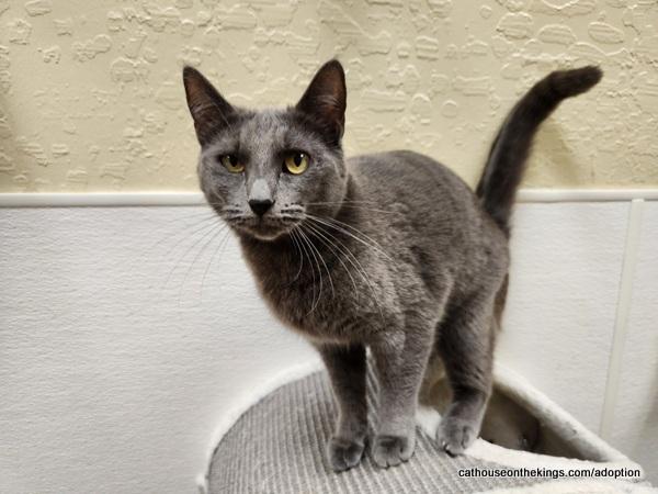 She’s a gorgeous petite Russian Blue. She was a young mama found in the bushes with her 6 babies all while being a baby herself. All are in good health. Despite her hard start she’s a very sweet and loving cat. She loves hanging out with her people including kids. She’s nice to dogs and other cats as well. She’s very chatty especially when treats are involved. She is a very smart girl and learned her manners very quickly. She loves playing with her catnip toys and kitty fishing rod.