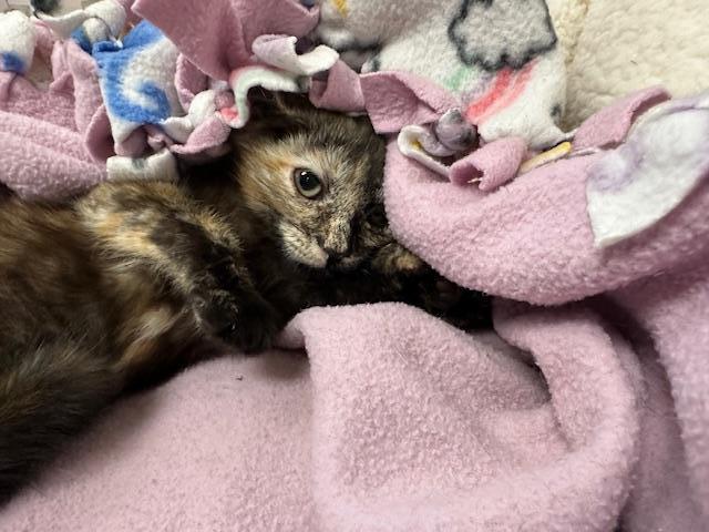 If you are patient, appreciate the unique qualities of tortoiseshell cats, and have one cat or more who would enjoy a friend, spunky Spicy is the girl for you! She’s a “cat’s cat”, meaning she really likes other cats, does also get along with dogs, and is coming along well warming up to people she trusts, but is not comfortable with children. She’s a classic tortie beauty, attired in a mystical blend of deep smoky tones with brushstrokes of pale ash and dark gold. When she looks at you with her light blue-green eyes, they seem to say she hopes you can see she’s a girl who just needs to be loved and appreciated. If you have a talent for extra patience and reassurance, fascinating Spicy could be your perfect match and devoted member of your loving circle.