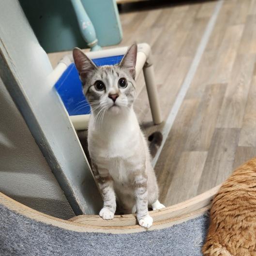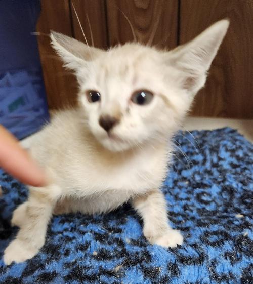 Whether he’s in his cuddle mode or his playtime mode, handsome Daniel is a wonderfully chill kitten! A game of hide’n’ seek with his blanket never gets old, with or without additional players! With his lively siblings he loves to romp and stomp and explore every nook and cranny, but he also loves to lounge around and be a happy observer. This bunny-soft sweetheart is a lovebug too who will hop right into your lap and give you the sweetest kisses while he gazes at you with his deep sapphire blue eyes! He has a smooth, soft coat of lux ivory, a picture-perfect face brushstroked with palest mocha, and a rosy pink nose, toe beans, and ears that make him pretty irresistible! The tension goes down and the serenity goes up when comfy, cuddly, mellow Daniel is on the scene! Could such a great boy be your forever family’s beloved new treasure?
