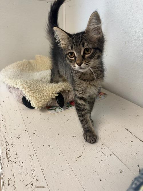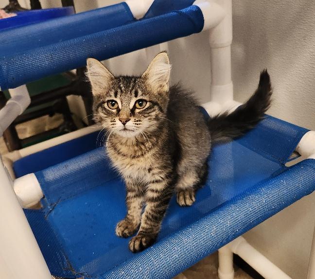 Playful, energetic little tabbasouras Mary makes the most of every playtime with her lively cutie pie playmates, whacking anything that rolls or dangles and chasing and racing for the sheer fun of it! In her beautiful, bunny-soft suit of brown tabby spots and stripes, she’s dressed for any occasion whether it’s sporty or quiet. She’s a little more reserved and observant meeting new people than her play mates, she likes to take a bit of extra time to assess and adjust to new situations, and will do best in a home with patience. She is sure to blossom into the love bug she has shown to be in her furrever home. She has gotten along well with bigger cats too and isn’t a bit finicky about food! Her personality is sweet and gentle and will make her a joy in a wonderful, loving forever home. Spritely, lovely, and companionable Mary be the cherished new addition in your welcoming world?