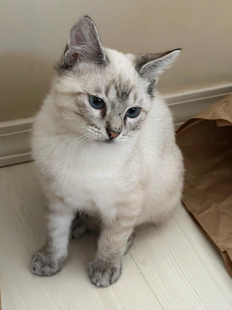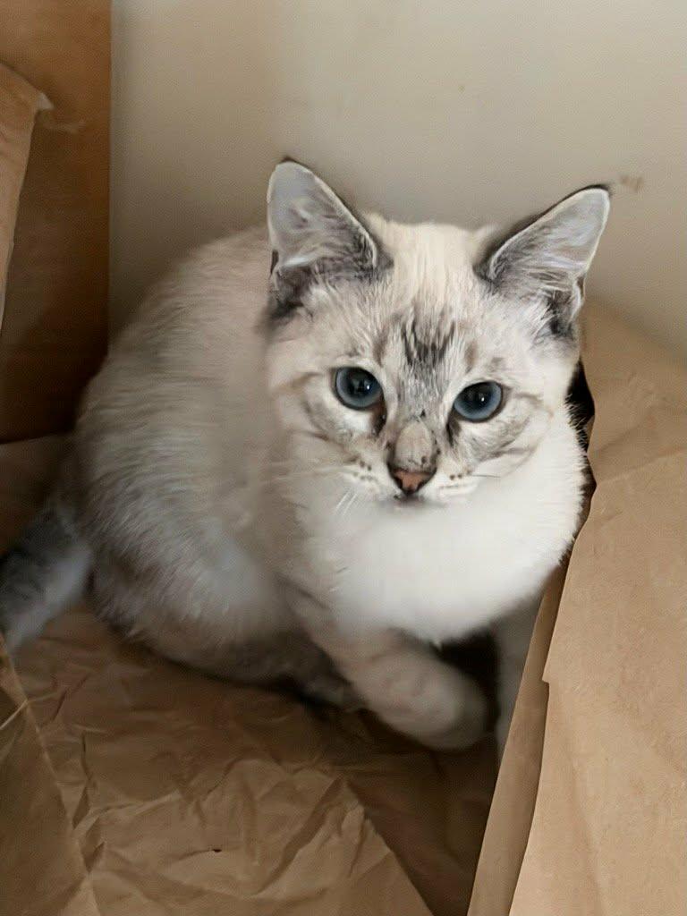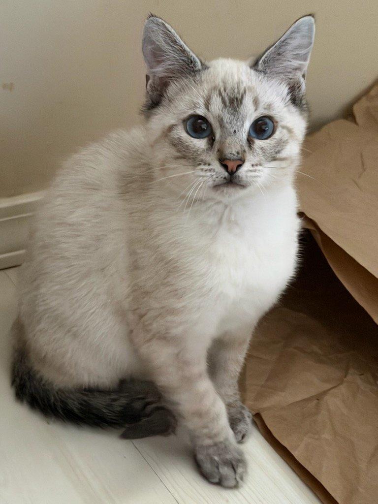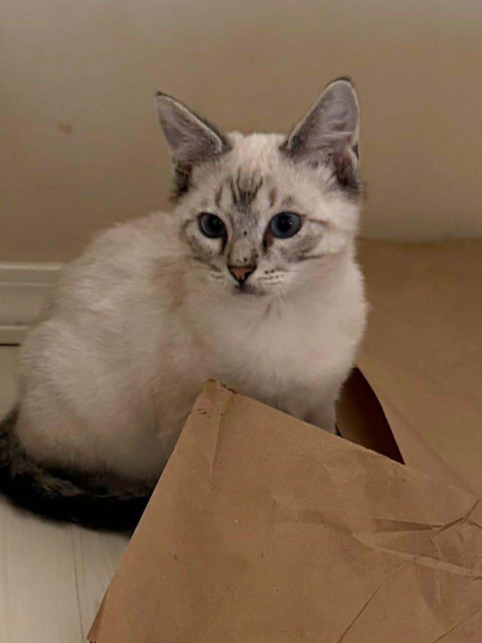 Ernie is a fluffy little cotton ball with stunning blue eyes and a heart full of love. This handsome Siamese boy is playful, curious, and endlessly entertaining—his lively antics will keep you smiling all day long. When he’s done playing, he’s happy to soak up affection and enjoy some quiet cuddle time.