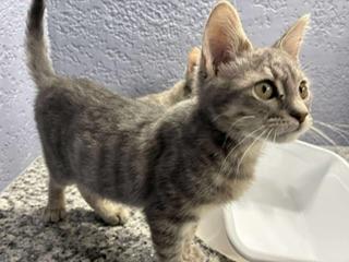 Meet Milo – a sleek grey tabby boy with charm, confidence, and endless kitten energy!