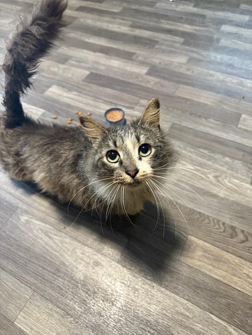 Meet Tabitha, a sweet and mellow fluffy tabby girl who’s ready to find her forever home! Originally, Tabitha was meant to be returned to the community, but her foster couldn't bear the thought of letting such a loving girl go, especially since she’s just too sweet to be outside. Staff suspected she was pregnant since she had some extra weight on her. Turned out Tabitha was already fixed and slightly overweight. Tabitha absolutely loves being pet and enjoys relaxing in the comfort of a safe and loving home. If you're looking for a cuddly companion who will fill your life with love, Tabitha might just be the purrfect match for you!