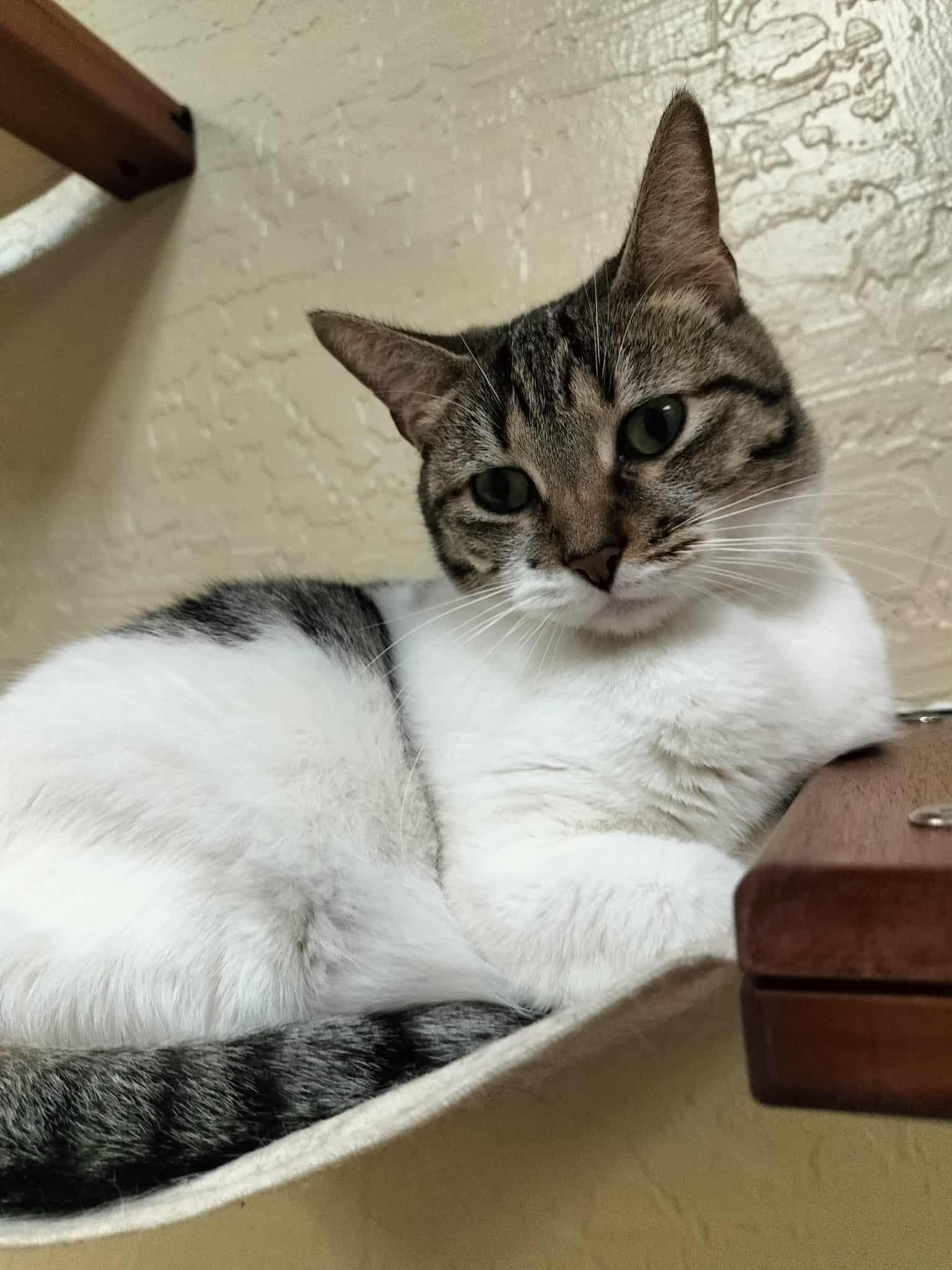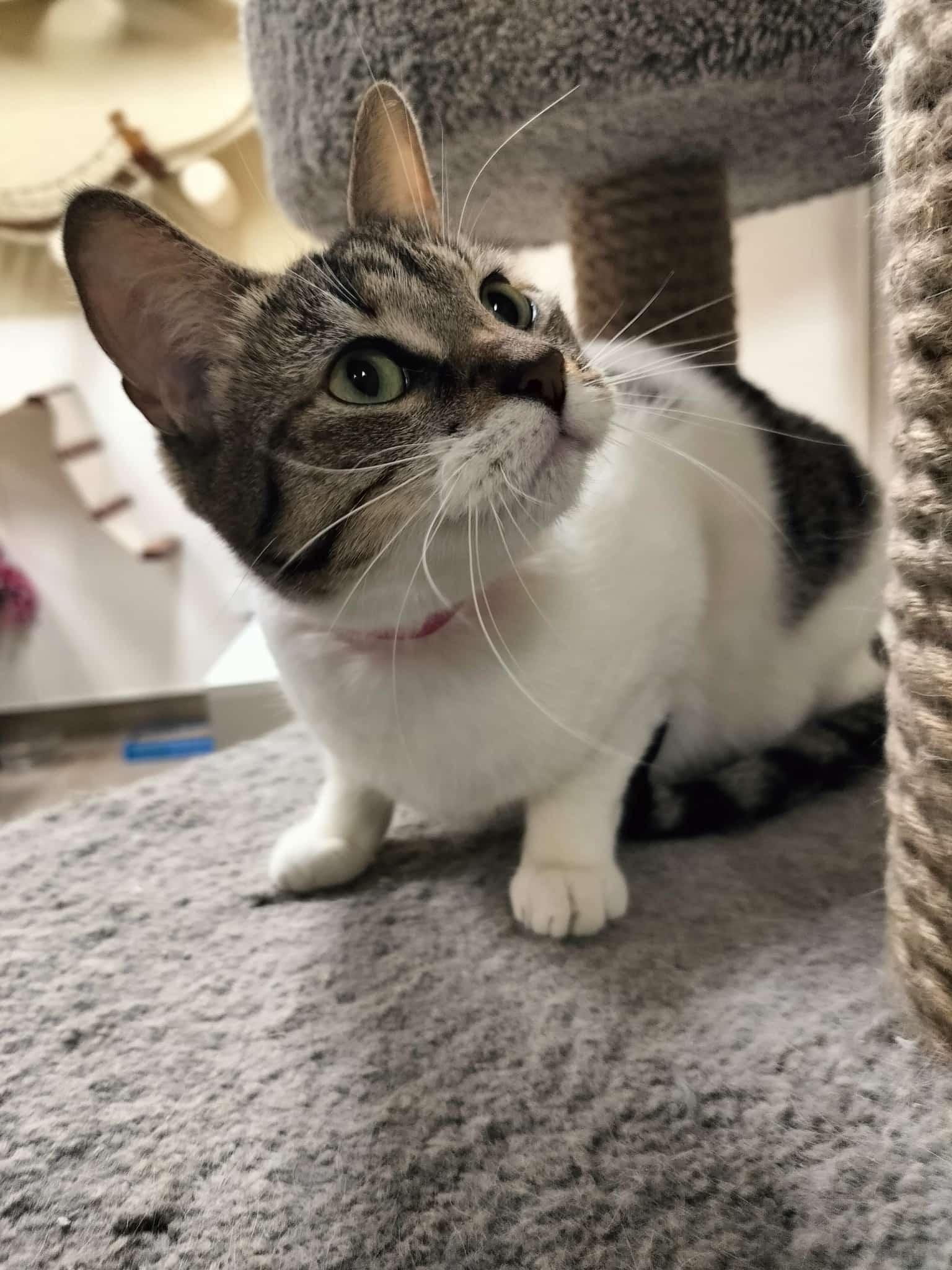 I am a tiny adorable little girl! I love to explore new spaces, and I get along great with dogs and other cats. I have the loudest purr you have ever heard, and to get them you just have to talk to me or hold me. I get excited over food and play. When I get lonely I will meow in the hallway, and no I will not come if you call, don't be silly, you have to come find me because that is real love in my eyes. If you do work or school at home that works out great for me because I like to sleep on warm laps. Love for me is only a cuddle away, I can't wait to meet you.