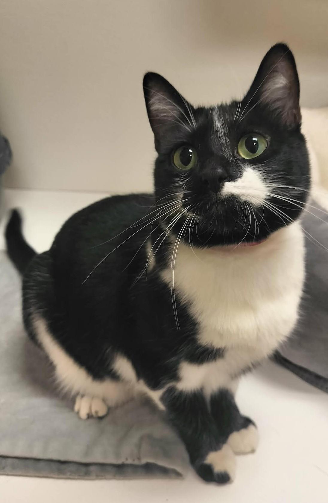 This adorable black and white female kitten is as charming as she is beautiful, sporting stunning markings just like her brother. Part of a lively litter of four, she arrived with her amazing mama cat, Deliah, and has been a delight ever since.