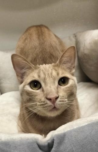 Muffin is the life of the party and the first in line at the food bowl! This orange tabby has a big personality and an even bigger voice—he loves to chat up a storm, keeping you entertained with his funny “meow-nologues.”