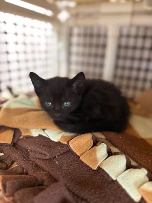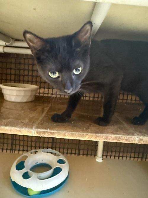Handsome little Miles is silky smooth and polished as ebony with a personality as warm as sunshine! His big, bright eyes take in everything - he'll be curious about everything you do. He loves to be petted and talked to and always hopes you'll find some time to invite him into your arms or lap for a cuddle or a nice nap! He doesn't mind other cats or the old office dog. Wouldn't a glossy black, sugar-sweet, happy-go-lucky little guy named Miles be purrfect for your loving forever home?