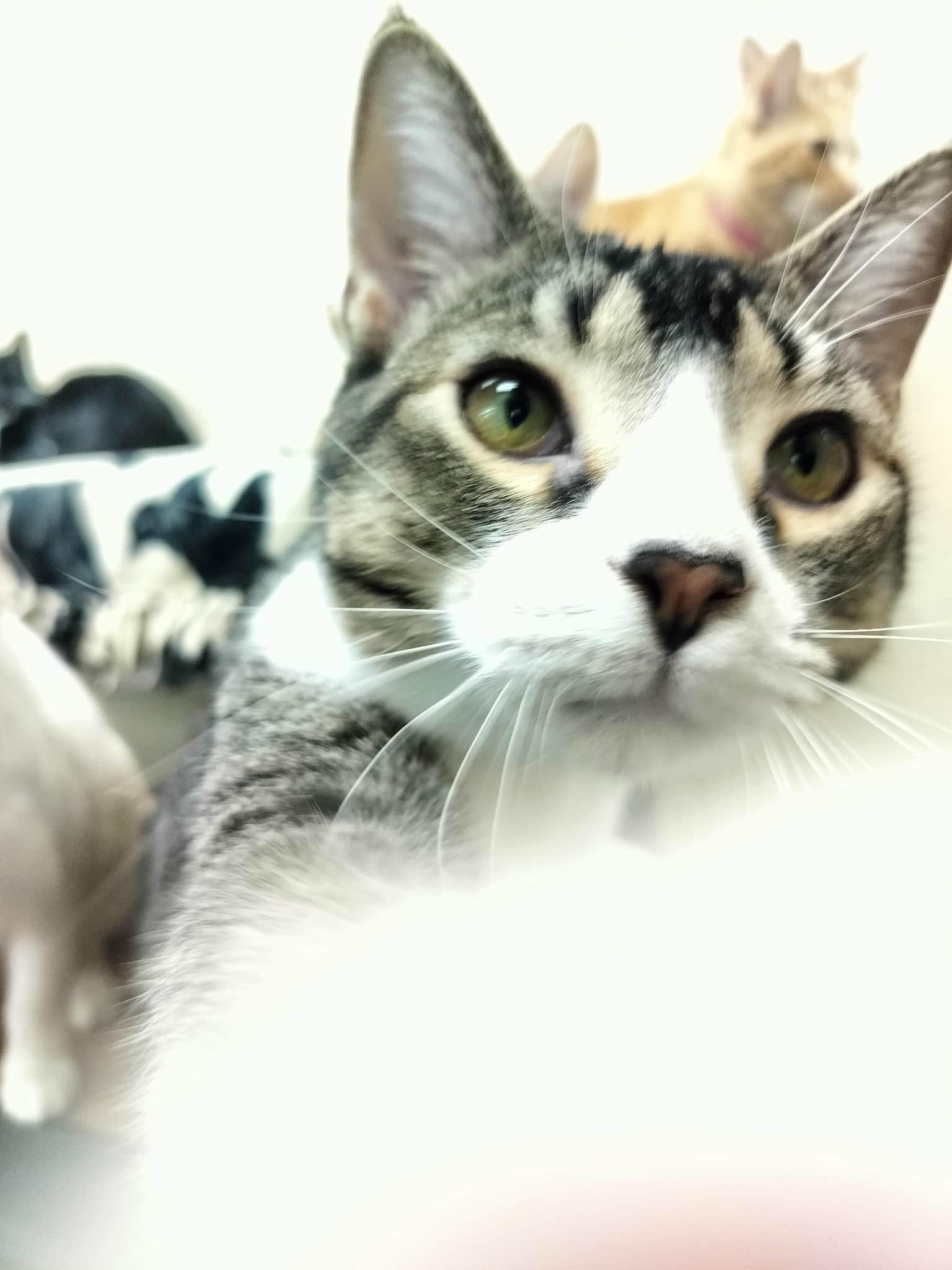 They love to climb, chase laser dots, and most of all, spend time with people. Whether it’s playtime or snuggle time, Tinker and Belle are always eager to be part of the action. You’ll often find them watching  kitty tv or entertaining each other with zoomies and tumbles.