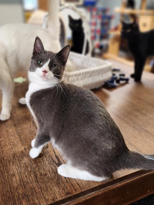 This calm and gentle cutiepie is Kami! She’s a classic gray and white jewel. Her pawsitively adorable dainty face looks like she’s been practicing a bit of make up application with soft white paint! The result: the cutest ever one-of-a-kind look! She arrived with her thre siblings and enjoys being in the adoption room enjoying kitten adventures, exploring, and interacting with people. Such an exotic little beauty with a sweet nature and loving heart will be a treasure in a perfect forever family. Precious Kami hopes she’s the perfect treasure for you.