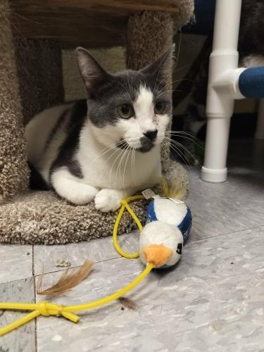 He’s a playful and social kitten who gets along wonderfully with his siblings and the other foster kittens. His favorite toys are anything that skitters across the floor—mice, balls, or anything he can bat with his paws!
