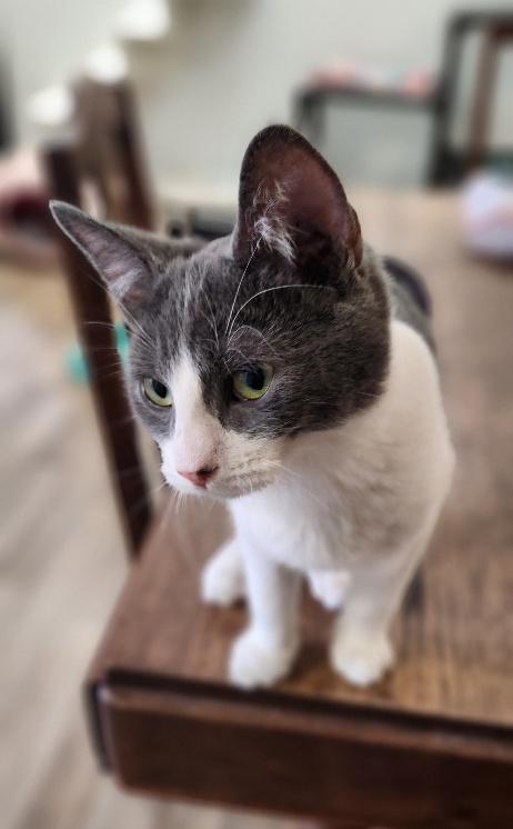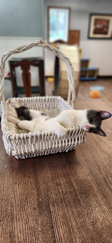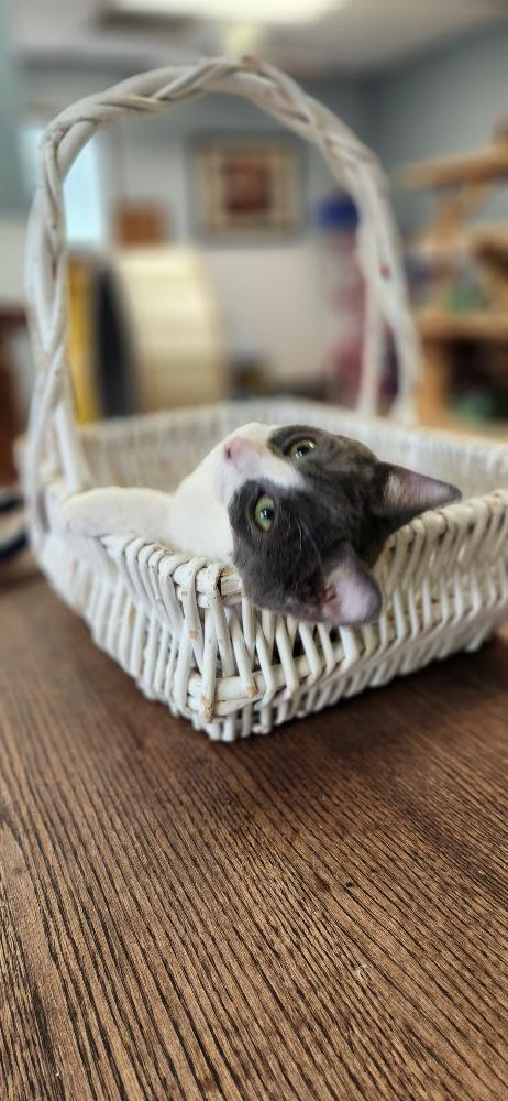 Handsome little meowman Moss may walk with a little swagger and bounce through playtimes with his sisters like he’s jet-propelled, but scoop him up and let him nestle in a blankie and he’s all cuddlebug boy! He’ll settle right in for the nicest little nap until it’s time to gear up for the next round of fun and games! He gets along well with kids, but he hasn’t met any bigger cats or dogs yet. This happy-go-lucky guy is perfectly attired for his busy lifestyle in an easy-care coat of distinguished dark gray and ivory, and his handsome face has a striking white flame all the way to the crown of his sweet fuzzy wuzzy noggin! Such a well-rounded boy is sure to bring his fun and affectionate nature to a great forever family of his own. Could meow-velous Moss be the perfect addition for you?