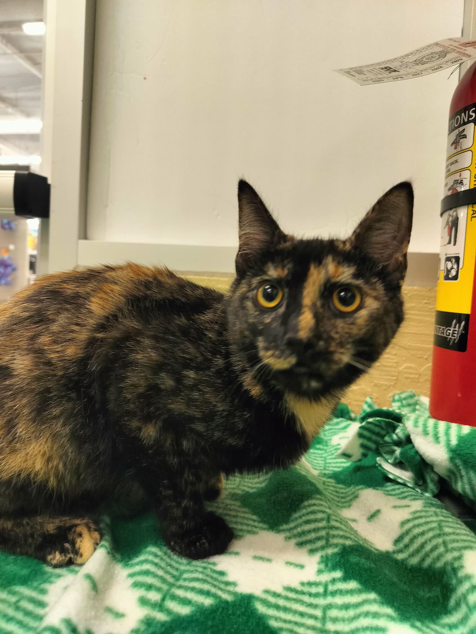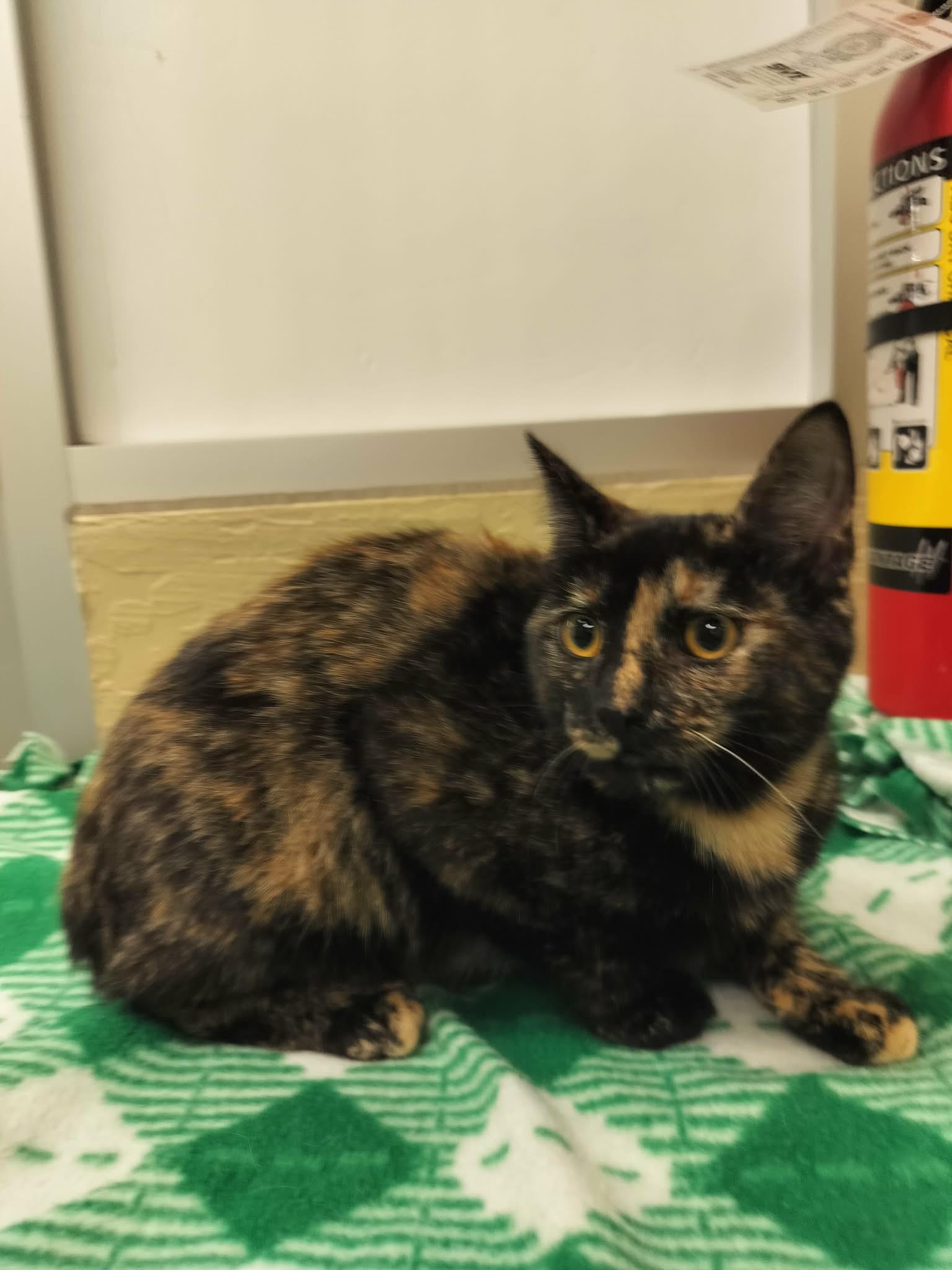 While she does display the typical tortie sass, this girl is a sweetheart through and through. She isn’t afraid to demand pets when she wants them. She will meow and purr to let you know. A confident and curious girl, she never seems fazed by anything, and is always ready to play, even with her much larger foster siblings. Her favorite toy is anything soft and squishy she can play with. She gets along with her foster siblings and the adult cats.