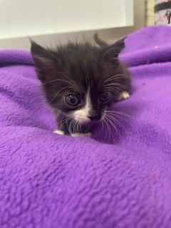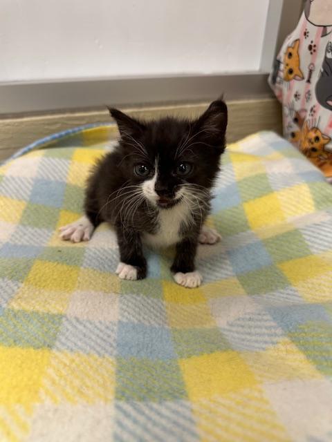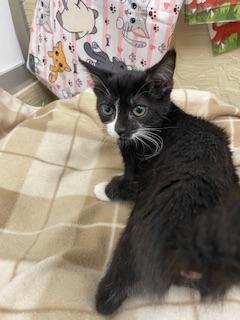 Resin is a dashing black and white tuxedo kitten with charm, energy, and a whole lot to say! This little lady n is full of personality—she’s constantly purring, chirping, and “talking” to anyone who will listen.