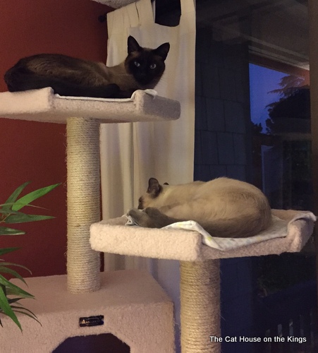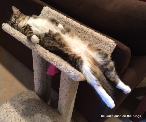He does have a very sweet disposition at times. If we are outside for a couple of hours and come in, he loves to be picked up and snuggled and he purrrrrrs! At bedtime, he loves to snuggle and has to suckle on a piece of sherpa cloth placed between us (so he doesn't get us and the bed clothing all wet) while kneading and purring like a motorcycle. It takes a lot of wiggling around until he gets to his perfect position for sleep (on an arm, shoulder, neck, etc. We love these sweet times.) Occasionally he will nap with Houdini. He has tried to crawl into the cat pod with Meetu but so far, no way she's going to allow that. (We have 3 pods so there are plenty to go around.)