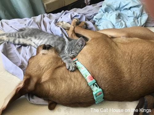 Lucky settled in and adjusted very quickly. His two housemates have adjusted pretty well too. Meetu, our frail, tiny, 17 yr old senior alpha cat definitely sets boundaries with him when he wants to play or annoy her by batting at her. She brooks no nonsense. And he respects that most of the time. Houdini, our 3 year old is delighted to have a playmate with whom he romps. Think herd of thundering elephants! At 3 yrs old he gets worn out and has to rest between rounds. Lucky seems to have endless energy but he eventually needs to nap too.