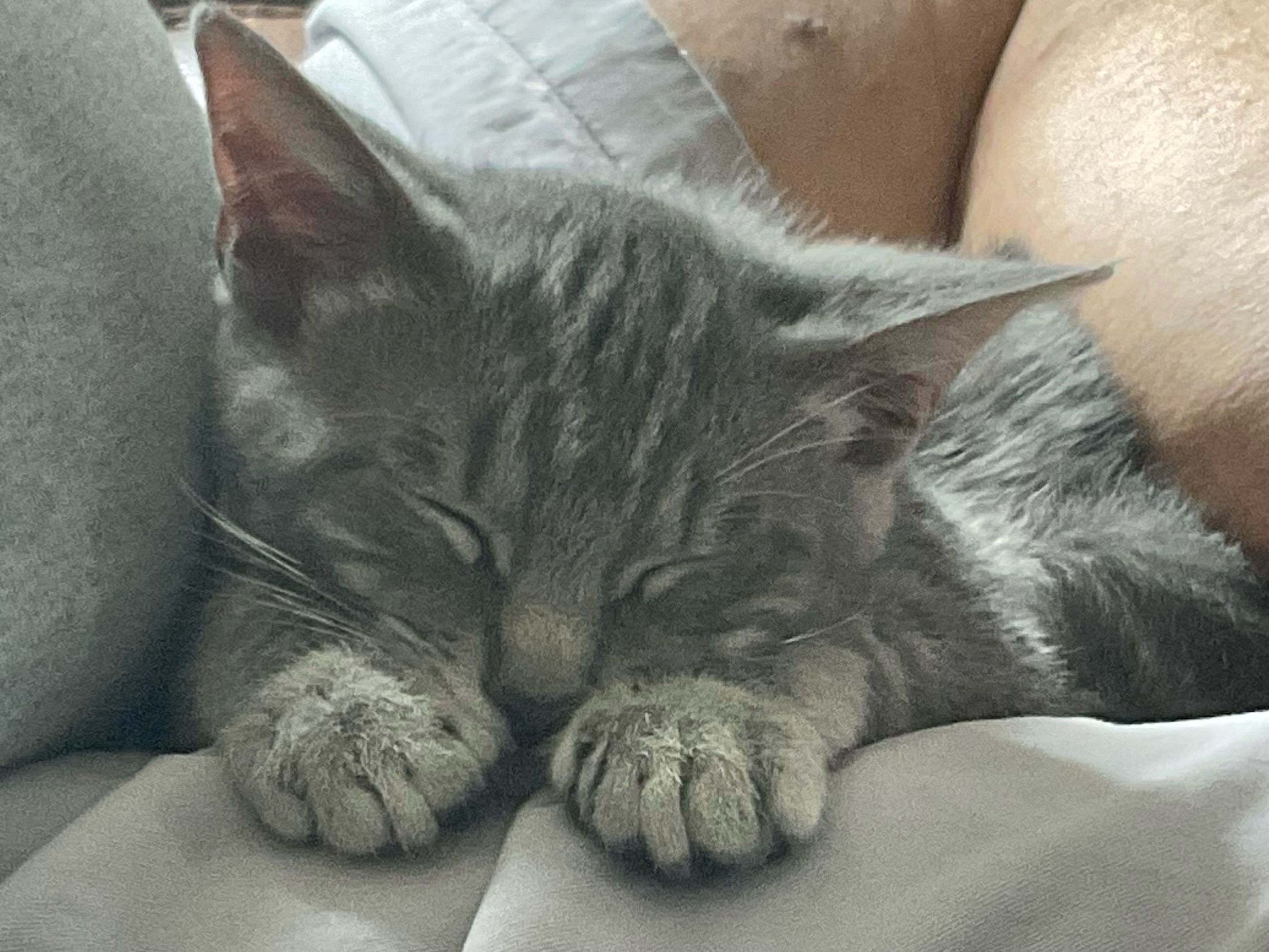 I am not sure who receives these, but the lady who we met with yesterday said that you folks like to get updates. Fella was pretty vocal about his dislike of the airline flight, but he was a champ with the TSA folks at the airport. Once we got home, I think that he figured out that this was his “home” now and became a purr machine and cuddle monster. He is now having a nap downstairs with my son.
